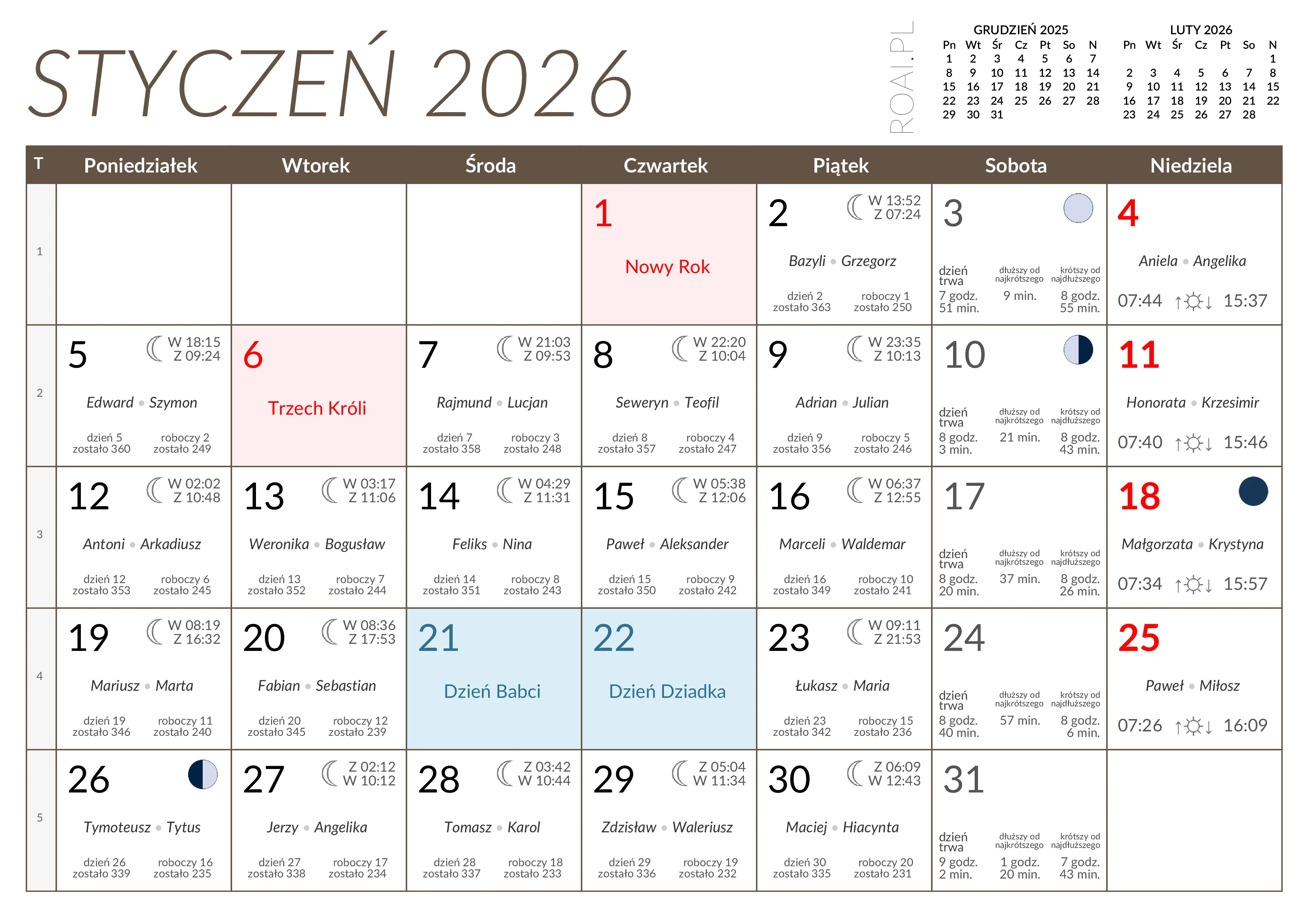 Poniżej gotowe do ściągnięcia kalendarze na wybrany rok oraz miesiąc w formacie .PDF oraz .WEBP. Prezentowane kalendarze dostępne są w standardowej kolorystyce oraz ustawieniach podstawowych. Jeżeli kalendarz nie spełnia Państwa oczekiwań to zapraszam do skorzystania w kreatora, który pozwala na dopasowanie kolorów i opcji.